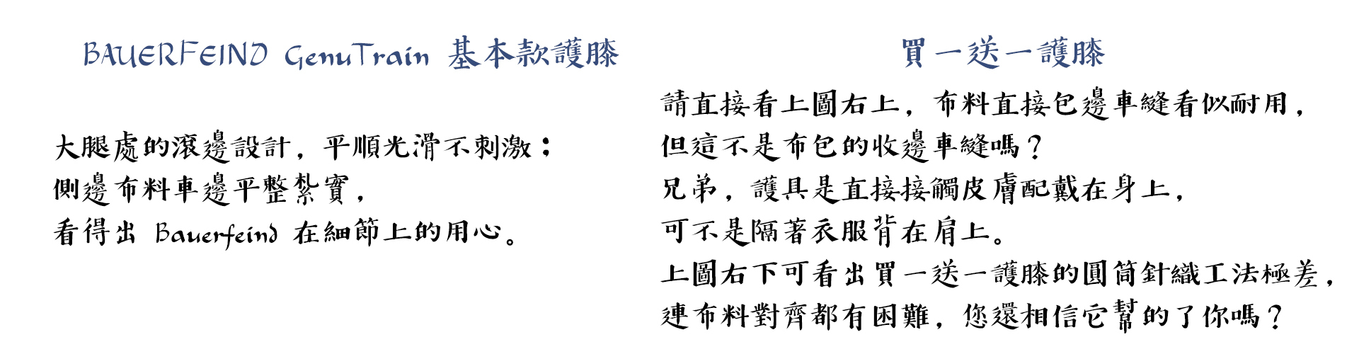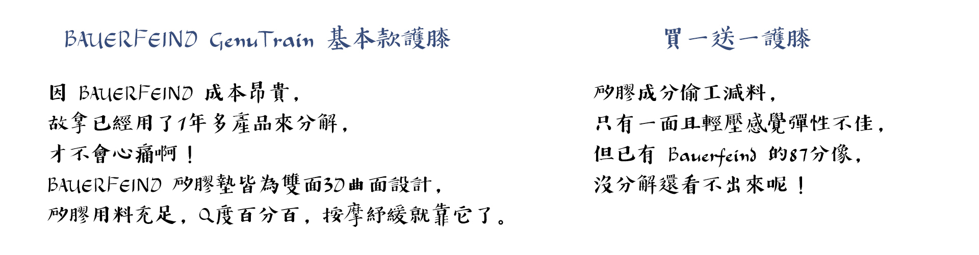 先介紹兩位主角,以下所有圖片左側為 Bauerfeind GenuTrain 基本款護膝,以下所有圖片右側是工作人員於網路訂購的護膝,要價1499元(以下稱買一送一護膝),此款品質已是眾多類似或仿冒品內的優良品種。